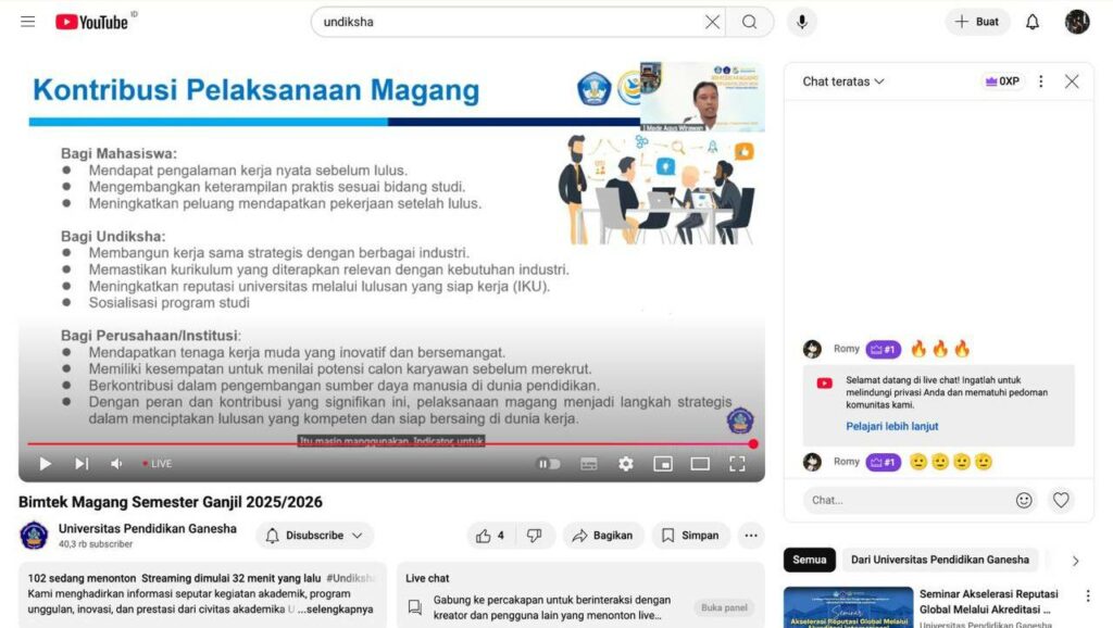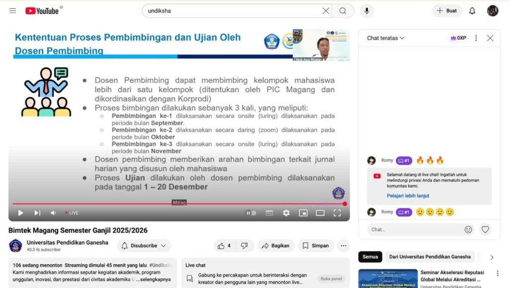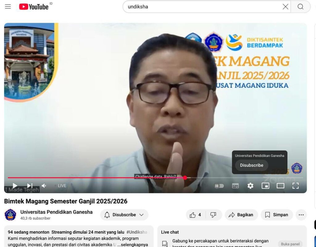 Singaraja – Lembaga Penjaminan Mutu dan Pengembangan Pembelajaran (LPMPP) Universitas Pendidikan Ganesha (Undiksha) melaksanakan kegiatan Bimbingan Teknis (Bimtek) Magang Reguler Semester Ganjil Tahun Akademik 2025/2026 pada hari Rabu, 3 September 2025 secara daring.